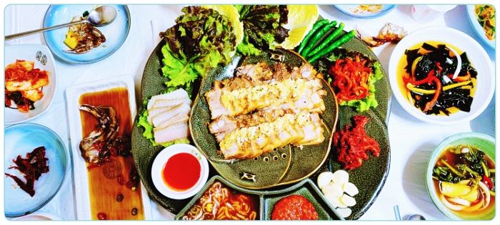 마늘보쌈+코다리구이+제주황게장+육개장+공기밥+푸짐한 반찬 3명이서 드시기에 좋은 한상차림
