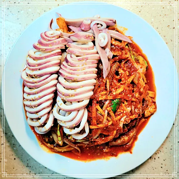갑자기 통오징어 숙회, 오징어 보쌈이 먹고싶어 달려간 생방송 오늘저녁 시장이 반찬 소개되었던 광명 전통 시장 맛집💕 이것저것 먹고싶은 마음은 가득하지만 유명한 떡, 라면사리 무한리필, 무제한, 부대찌개, 모듬전 통오징어 숙회, 오징어 보쌈 시켰어욤☺️ 넘넘 맛있어서 따로 싸가고싶을 정도.. 결국 통오징어 숙회, 오징어 보쌈 더 추가로 시켜버렸습니다.