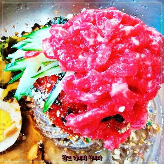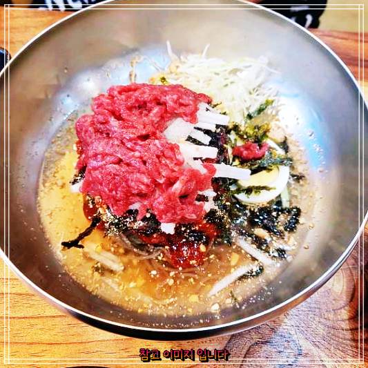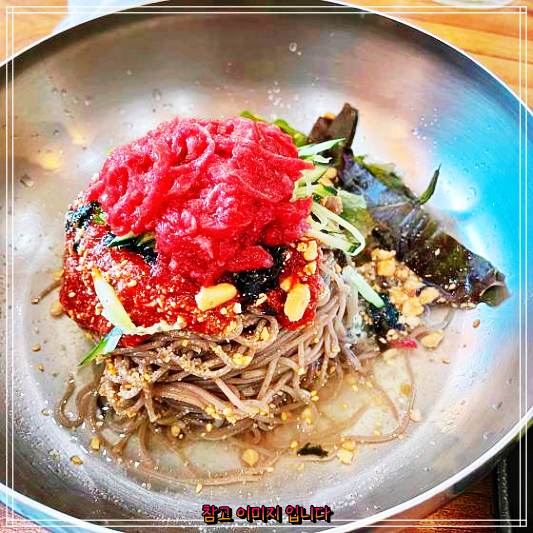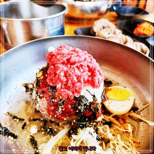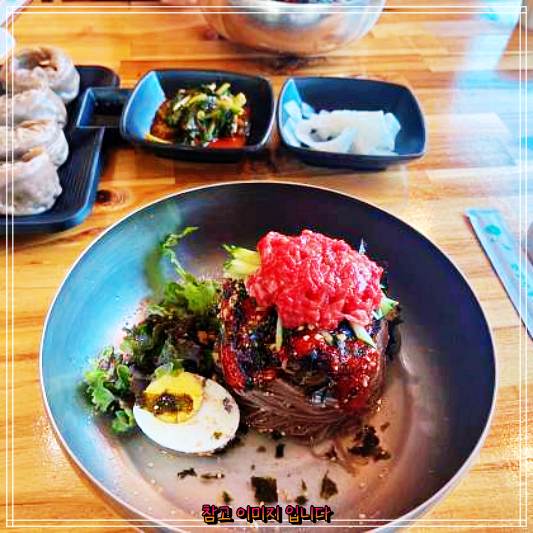 한우육회막국수 나오자마자 정신없이 먹다가 정신 차리고 사진을 찍음! 히힛~ 한우육회막국수 넘 맛있어영!!!! 사골우거지탕 메밀왕만두 도 맛있드라규영!!!!!! 테이블 서빙 해주시는 분도 넘흐 친절하시그영!!!!! 아주 잘먹고 가영!!!!♡-♡