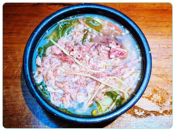 55년 전통의 해장국집은 이미 애주가들 사이에서 소문이 자자하더군요. 연예계 애주가로 유명한 신동엽 씨도 오랜 단골이라지요. 일반 선짓국과 달리 국물이 투명하리만치 맑디맑은 것이 시원하면서도 깊은 맛을 냈습니다. 건더기도 풍부해 토렴한 밥에 신선한 한우 선지와 뭉글뭉글하게 푹 끓여낸 우거지, 그리고 잘게 썬 양지를 위에 올려 후루룩 먹기 좋더군요. 신선할 때만 맛볼 수 있는 소 등골까지 맛보니 그야말로 완벽한 조합이었습니다.